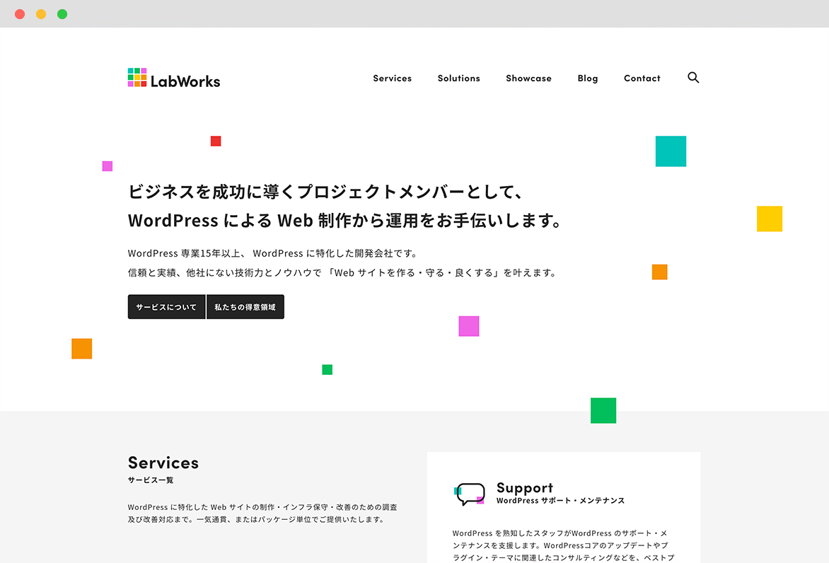 ビジネスを成功に導くプロジェクトメンバーとして、WordPress による Web 制作から運用をお手伝いします。