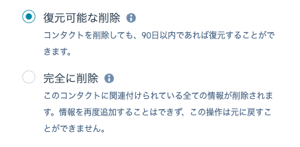 HubSpot ではコンタクトの削除を2種類から選べます。1つは 90 日間の猶予期間を持つ「復元可能な削除」で、もう1つが「完全な削除」です。